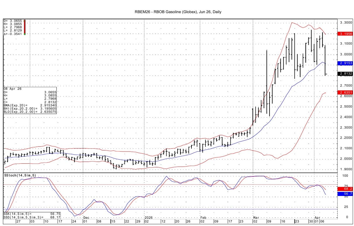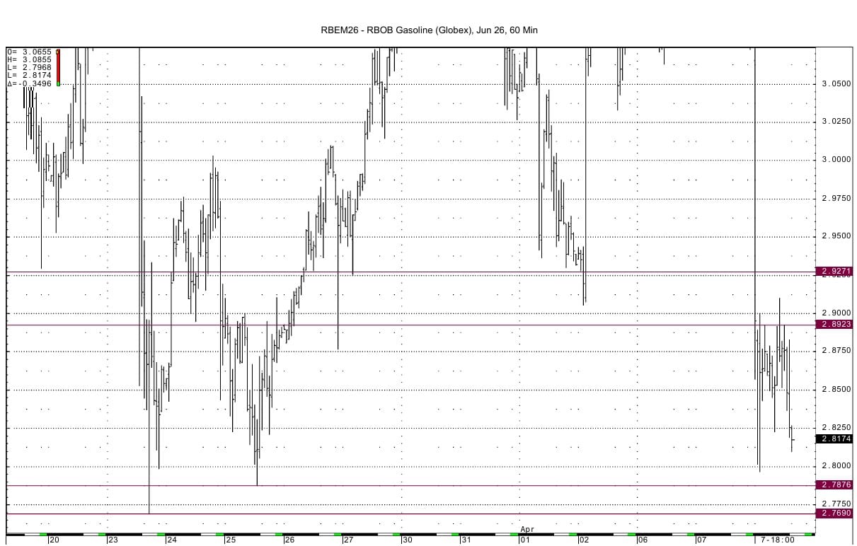 June RB--now the highest volume contract month-sees support at 2.7876 and then at 2.7690. Resistance lies at 2.8915-2.8925 and then at 2.9263-2.9284.