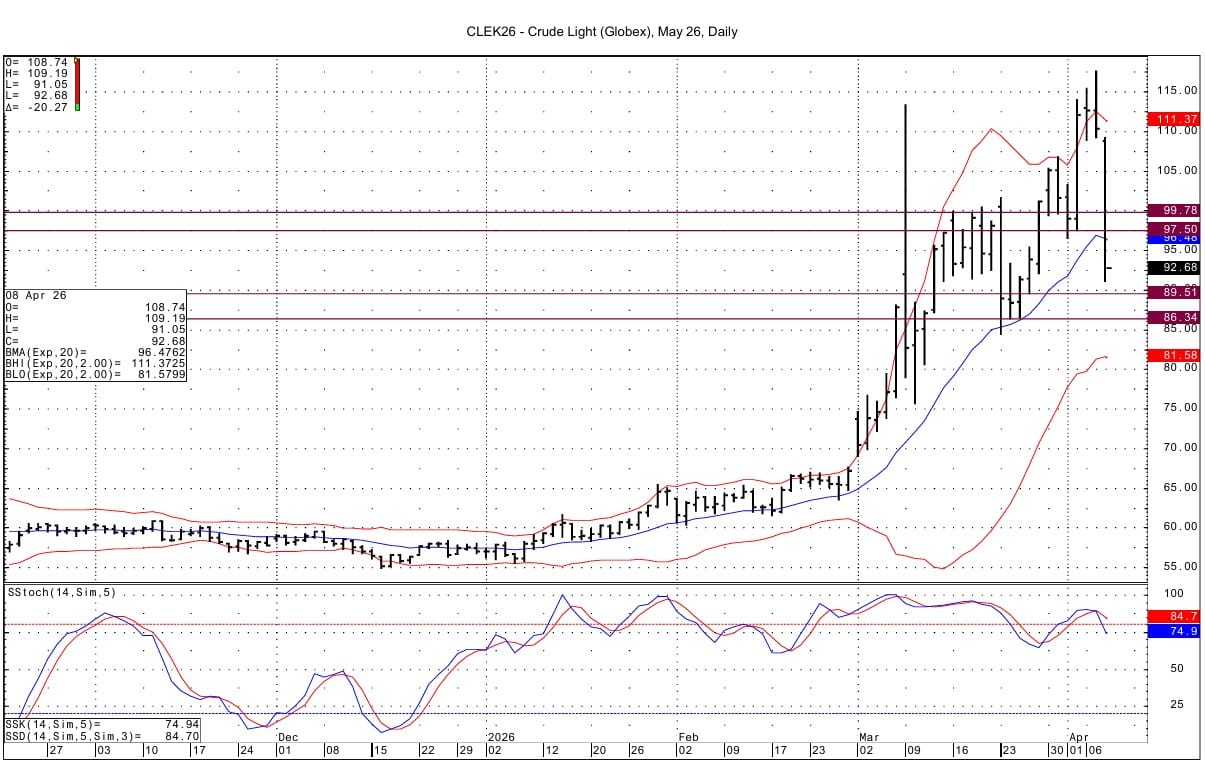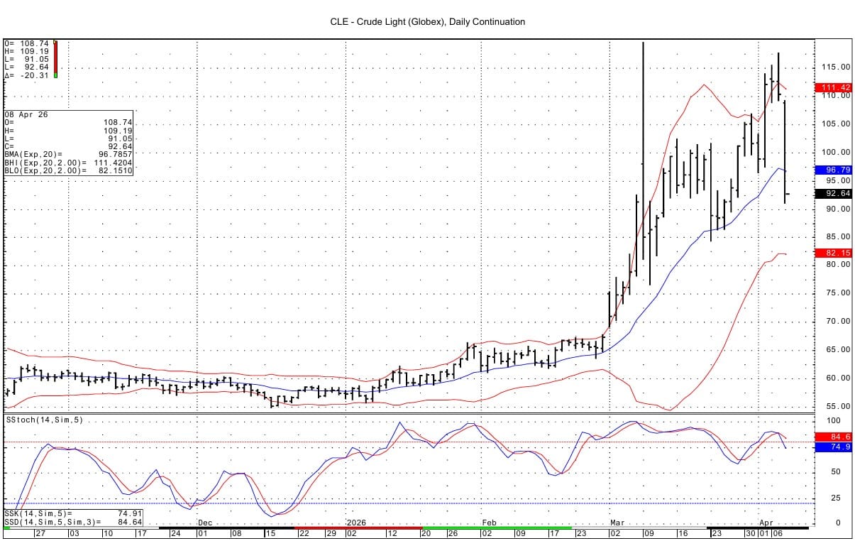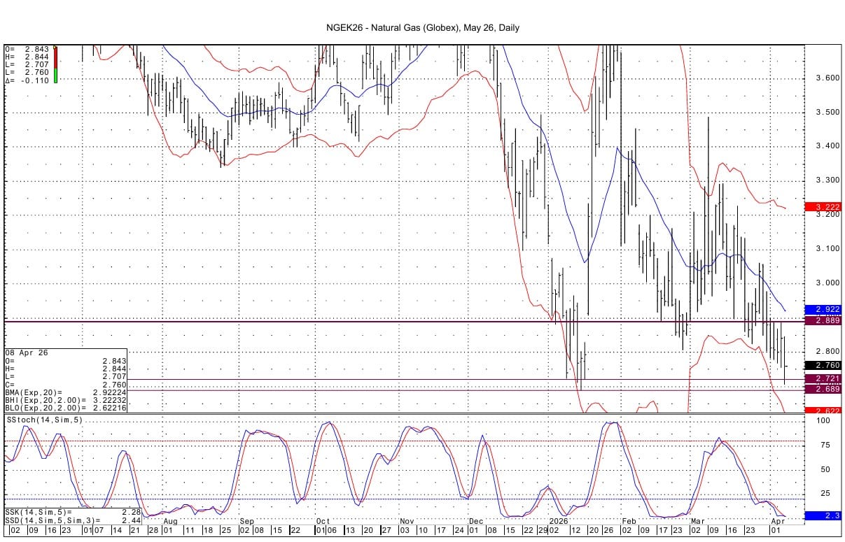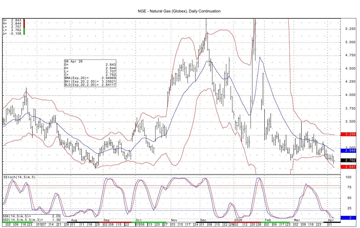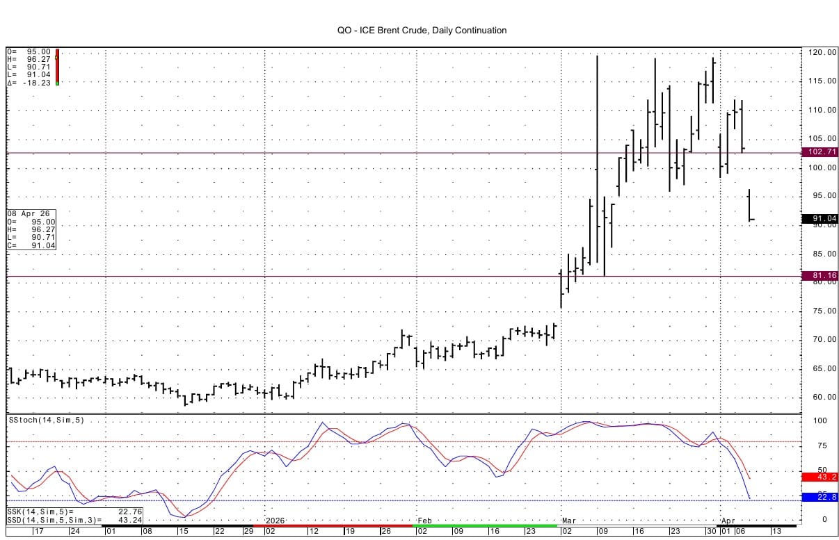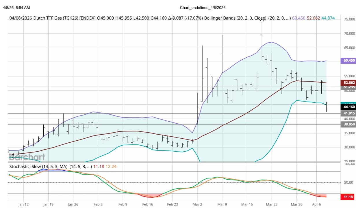 TTF spot European gas futures prices have gapped lower on the back of the ceasefire agreement in the Mideast. The gap goes up to Euro 48.830. The current price for the spot May TTF futures is 44.300 Euro/Mwh (=$15.22 /MWH). The TTF price is thus down nearly 17% from Tuesday's settlement. The drop is the biggest one-day reduction in more than two years. The contract has tested the DC chart's lower bollinger band today. That band lies at about Euro 45.25. Support is seen at the 42 Euro area and then at the 38 Euro area. Above the gap, resistance comes in at 50.50-50.56.
