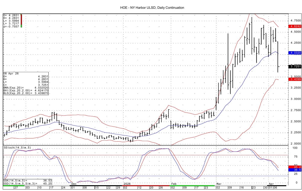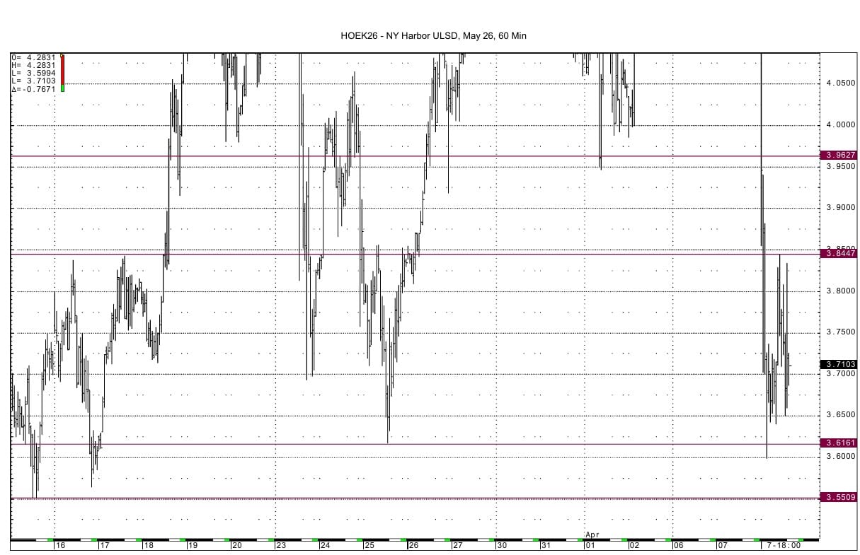 The ULSD DC chart shows a gap up to 4.2908. May ULSD support comes in at 3.6161-3.6178 and then at 3.5509-3.5518. Resistance comes in at 3.8425-3.8447 and then at 3.9616-3.9627.