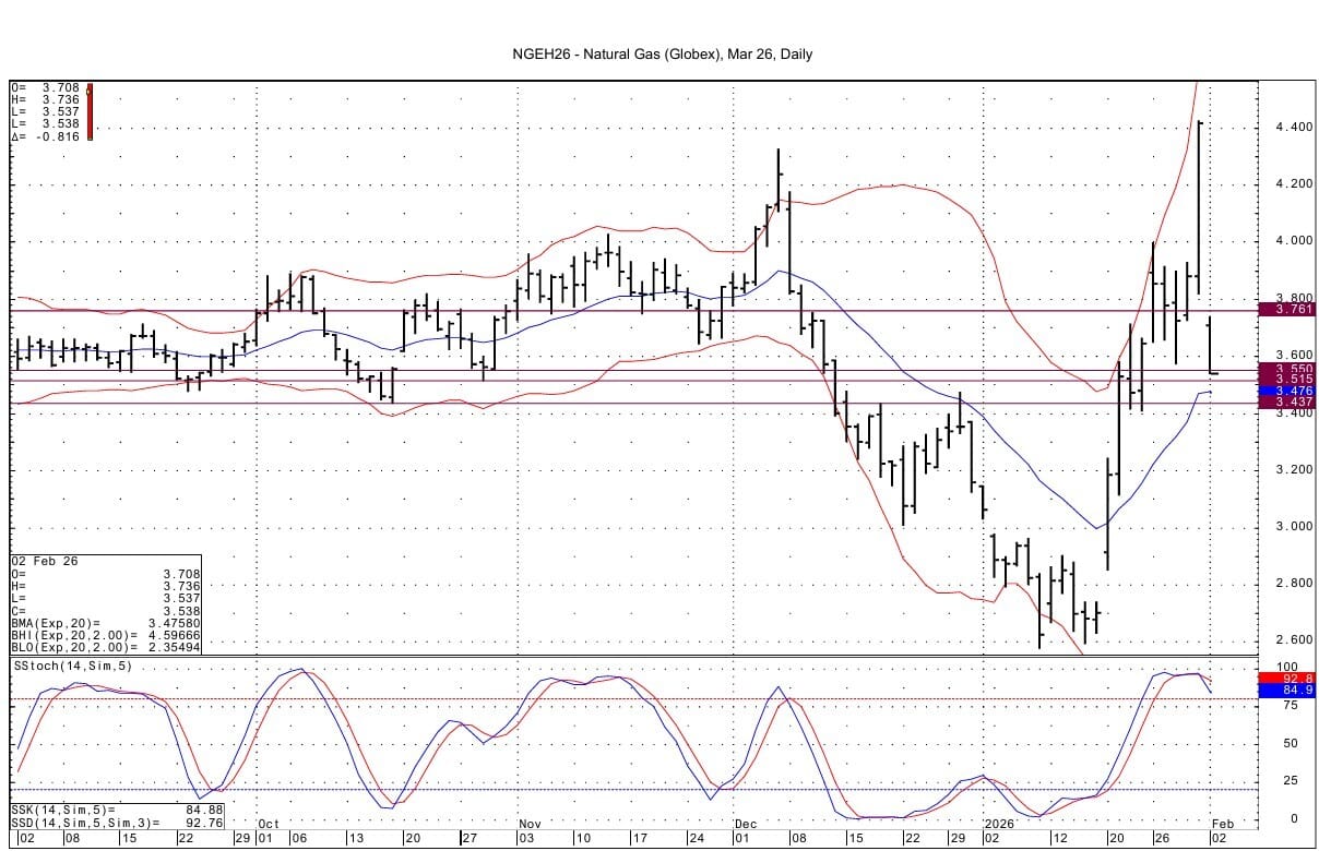 The $3.736 high for the NG futures session today was seen on the opening last night. The gap from the weekend goes up to 3.818. Momentum has turned negative in the sharp selloff. Support at 3.543-3.550 has been pierced today with a current low of 3.537. Next support is then at 3.510-3.515 and then at 3.434-3.437. Resistance comes in at 3.761-3.768.