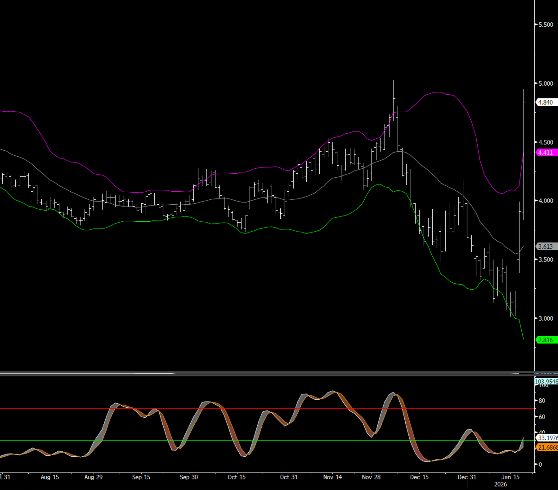 NG futures have surged higher today on the back of expected very strong demand and the possibility for freeze offs that will shut in some production. Average L48 temperatures are forecast to drop well below normal from Jan. 23 and extending into early February. Celsius Energy is projecting a draw of 370 BCF for the week of Jan 24-Jan 30 --that would be the largest ever draw --topping the -359 BCF figure from January 2018. Some short covering has also likely helped boost the NG higher the past 2 days.