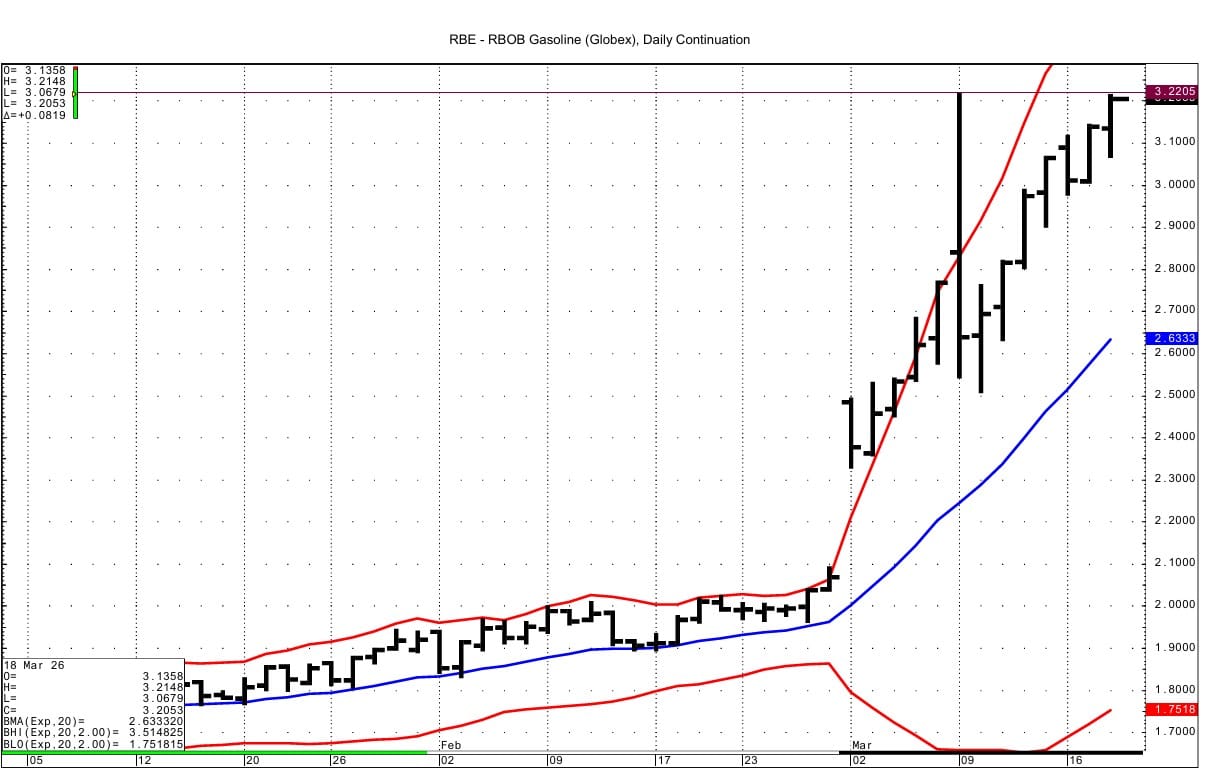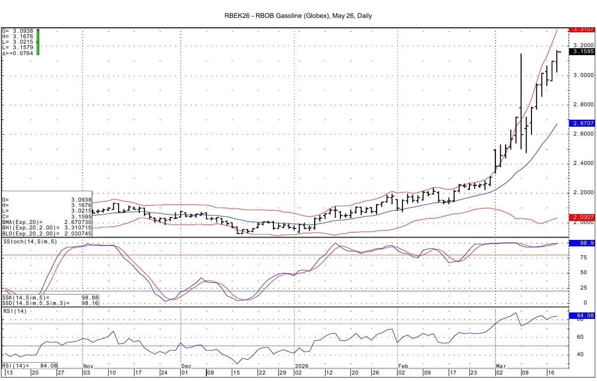 May RB futures have risen to a fresh high for the contract. Resistance may be seen at 3.2205 which is the recent RB spot futures high. Support comes in at 3.0800. There is a stepladder up pattern to the chart.