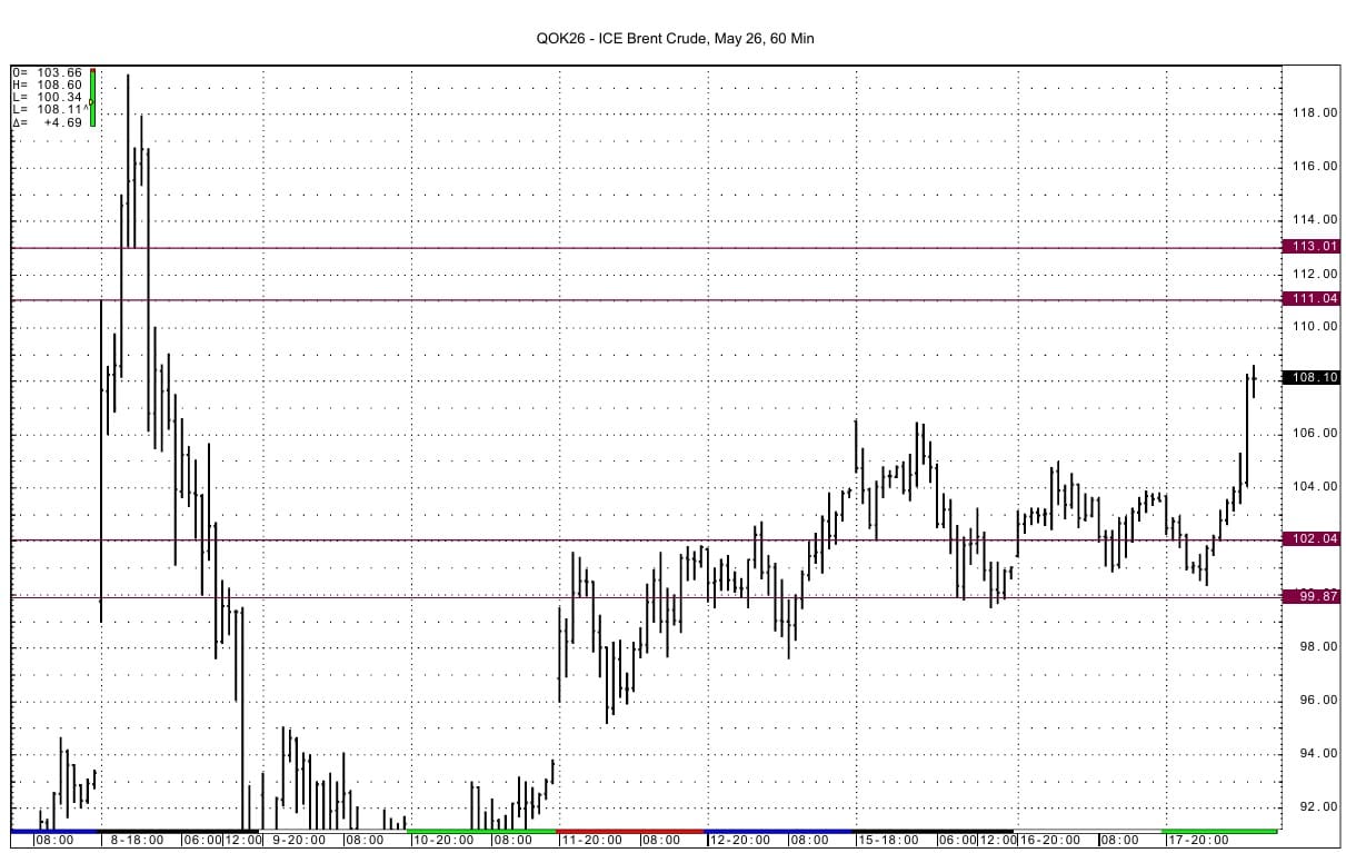 ING offers the following commentary re Brent crude prices:" ICE Brent has now settled above $100/bbl for four consecutive days. With no sign of de-escalation in the Middle East, the market continues to consolidate above this key level. " Support is seen at the $102 area and then at the $99.80 level. Resistance is seen at the $111 and then $113 areas--as per the May 60 minute chart.