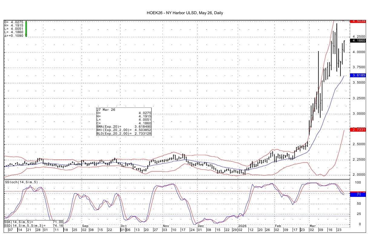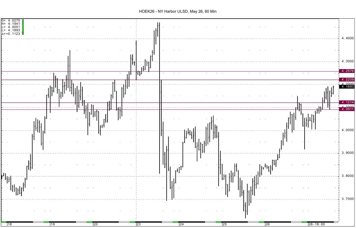 May ULSD support is seen at 4.1208-4.1214 and then at 4.0911-4.0928. The overnight low is 4.0051. Resistance comes in at 4.2203-4.2212 and then at 4.2565-4.2586.