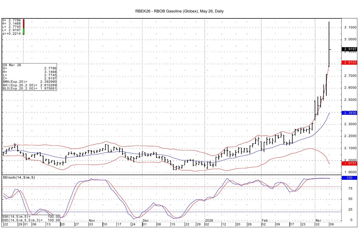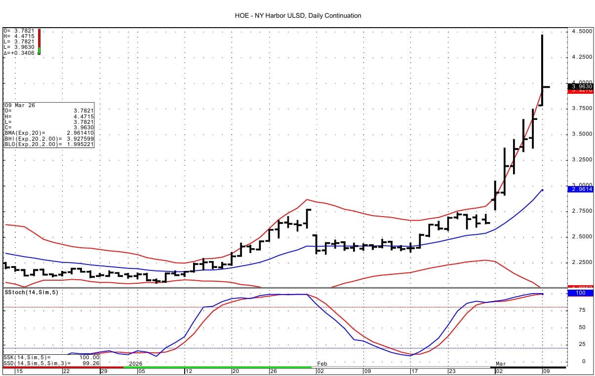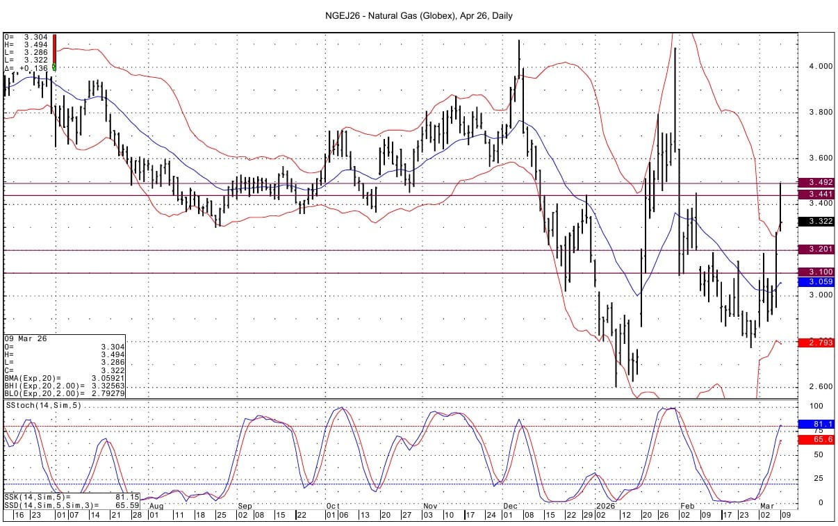 April ULSD futures support is seen at 3.7821 and then at the filling of the gap at 3.7485. Resistance comes in at 4.2200-4.2252 and then at 4.3799-4.3822. The overnight high lies above that at 4.4715. The DC chart's upper bollinger band lies at 3.9304.