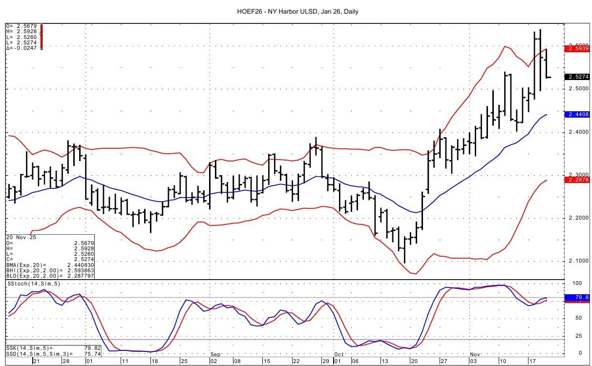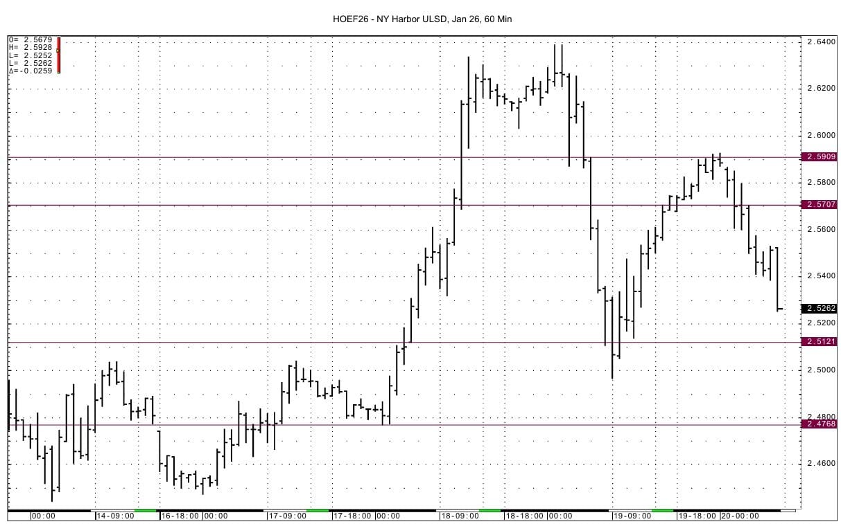 On Wednesday, January ULSD confirmed the mean reversion setup from the day before--having closed back below the upper bollinger band on the daily chart. Resistance comes in at 2.5705-2.5707 and then at 2.5909-2.5928, which is the overnight high. The highs from the prior 2 sessions are well above at over 2.63. Support lies at 2.5108-2.5121 and then at 2.4768-2.4774. Our supports and resistances are from the January 60 minute chart.
