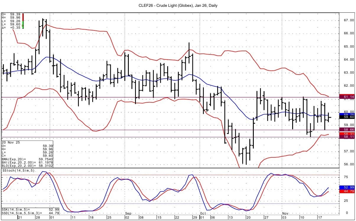 January WTI is up 48 cents at $59.73 January RB is down 0.28 cents at $1.8576 January ULSD is down 3.12 cents at $2.5209