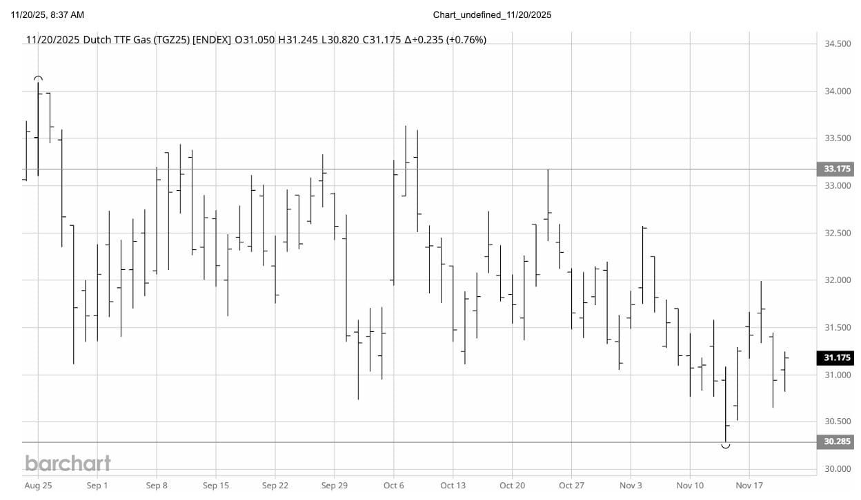 ING reporting shows net long positioning in the TTF futures to have been pared to its lowest level since March 2024. This was driven by fresh shorts, which ING says have reached a record gross position, which they add leaves the market prone to a possible short covering rally in the event of any supply surprises or extended cold snaps over the winter. The possibility for a US peace deal in Ukraine is a negative for the contract, while inventories at 81% is supportive as they are down from a peak of just over 83% in mid-October. The 5-year average for this time of year is 91% full. (Barchart) Analysts from trading firm Mind Energy wrote the market seemed to be shrugging off approaching cold weather and pipeline constraints from Norway and Algeria. (NGI) Technically TTF prices have been in an overall range for the past 3 months.