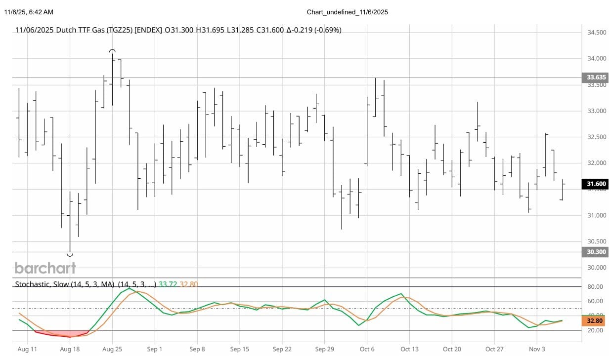 TTF European gas futures are slightly lower with market commentary citing strong LNG imports. "The market shrugged off concerns that lower-than-expected wind power generation would boost demand for natural gas, instead focusing on the rising availability of supply," ANZ analysts say. The latest positioning data shows that investment funds cut their net long in TTF by 24.8TWh over the last week to 21.4TWh, the smallest net long held since March 2024. In fact, the investment fund gross short stands at a record high of a little more than 393TWh, despite the European balance remaining vulnerable in the 2025/26 winter, with storage 83% full vs. a five-year average of 92%. "The large gross short does leave some positioning risk in the market, particularly if there are any surprises through the heating season," ING analysts say. (WSJ) Here, as in the JKM market, the TTF futures have a mostly sideways pattern to price action seen over the past 3 months.