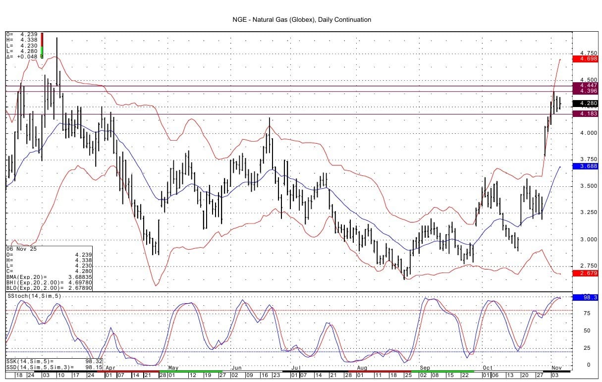 Technically, momentum on the NG DC chart looks to be cresting and is overbought. Resistance is seen at the high of 2 days ago at 4.396 and then at 4.444-4.447. Support comes in at 4.183-4.186.