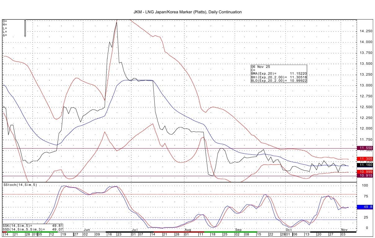 Above average winter temperatures in large parts of China may curb the nation’s LNG imports further: Bloomberg. The JKM Asian futures gas contract has been in a narrow sideways trading pattern over the last 3 months, with highs near $11.550 and lows near $10.915 /MMBtu during that time.