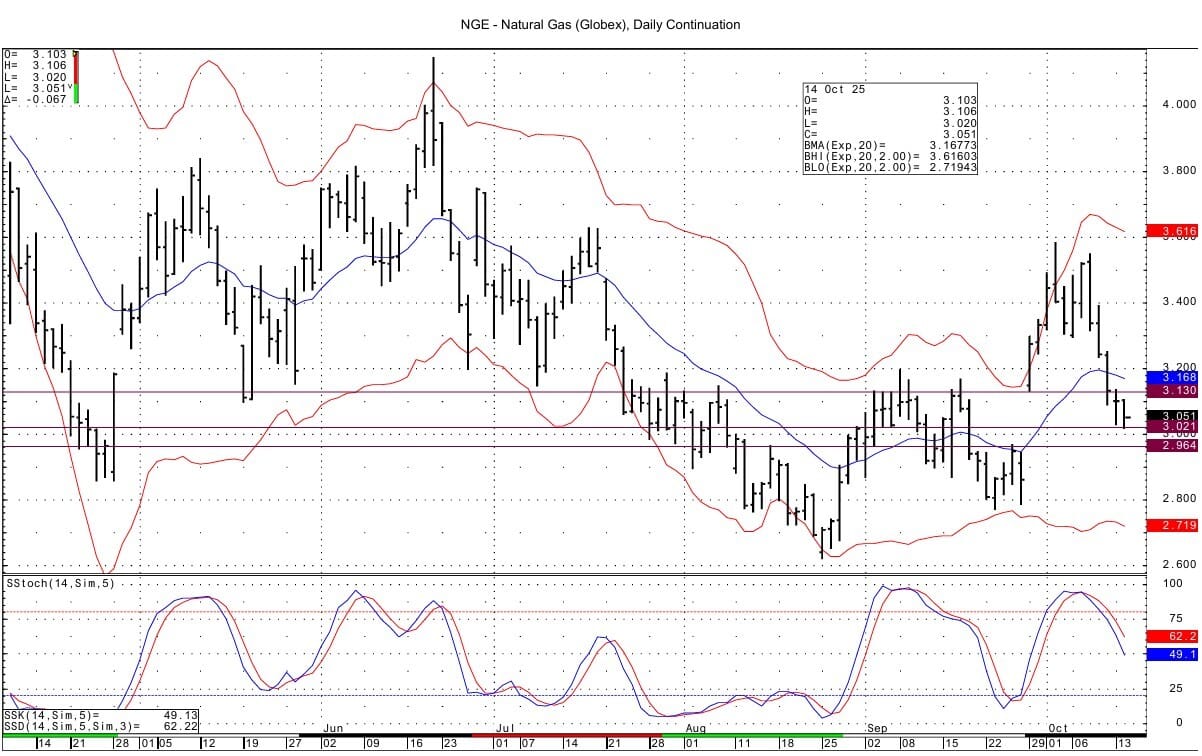 NG futures are lower as one market analyst's comment sums up pricing: “Yet until colder weather arrives, it may remain difficult for natural gas to sustain a break higher.”