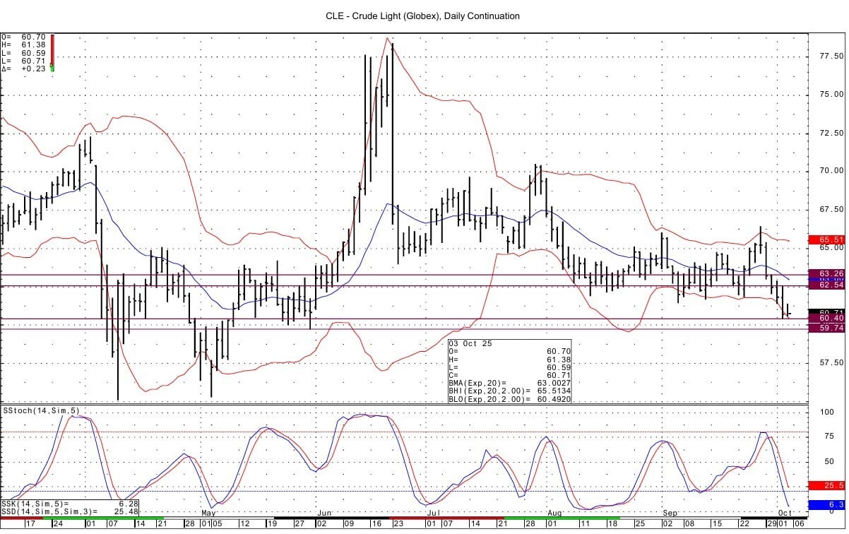 Technically WTI spot futures have a mean reversion setup with Thursday's close under the lower bollinger band on the DC chart. That band lies at 60.49. Support basis the DC chart lies just below that at yesterday's low at 60.40-60.47. Below that support lies at 59.74. Resistance comes in at 62.52-62.58 and then at 63.18-63.26.