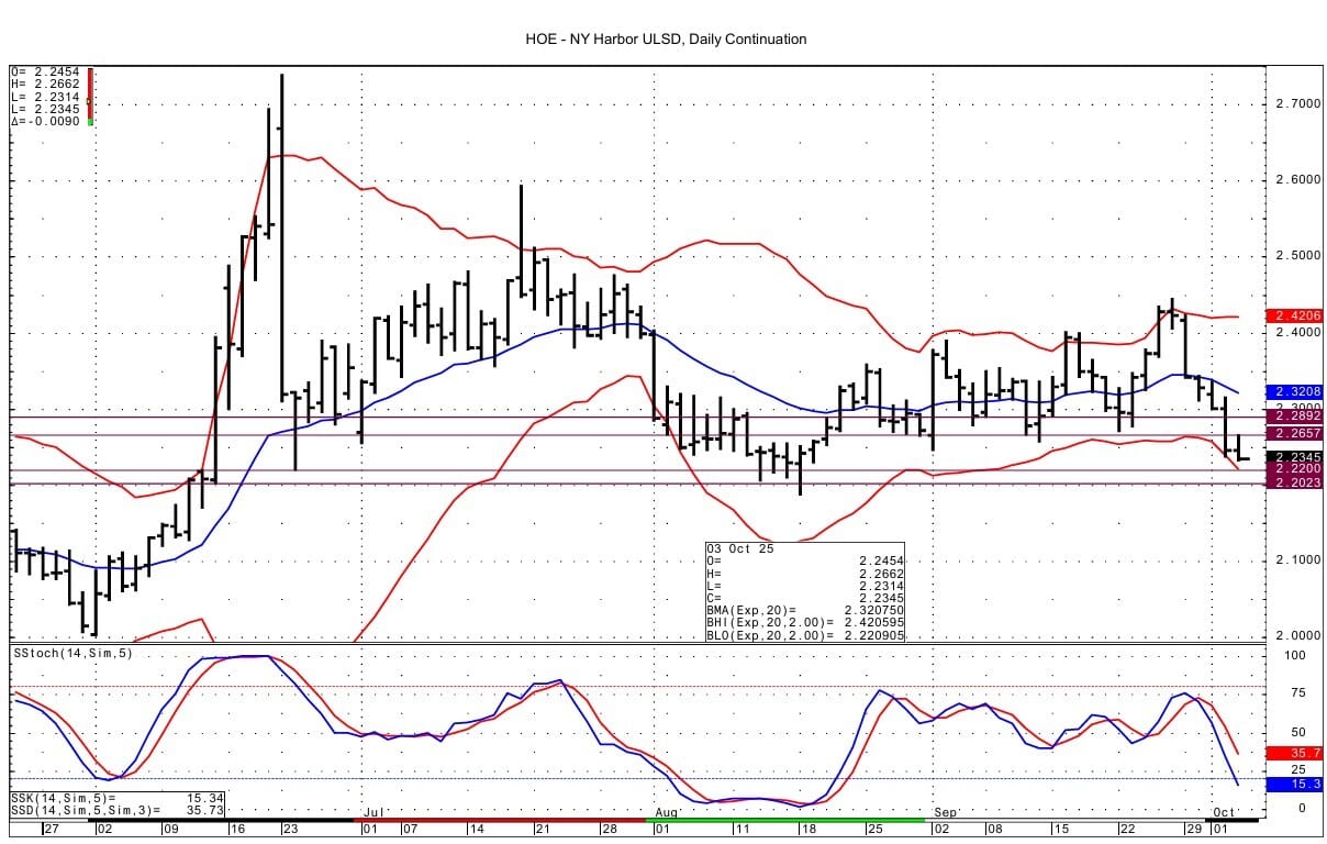 ULSD spot futures support comes in at 2.2200 and then at 2.2023-2.2057. The DC chart's lower bollinger band intersecting at 2.2210 lies above the supports we see Resistance is seen at today's high at 2.2644-2.2662 and then at 2.2892-2.2899.