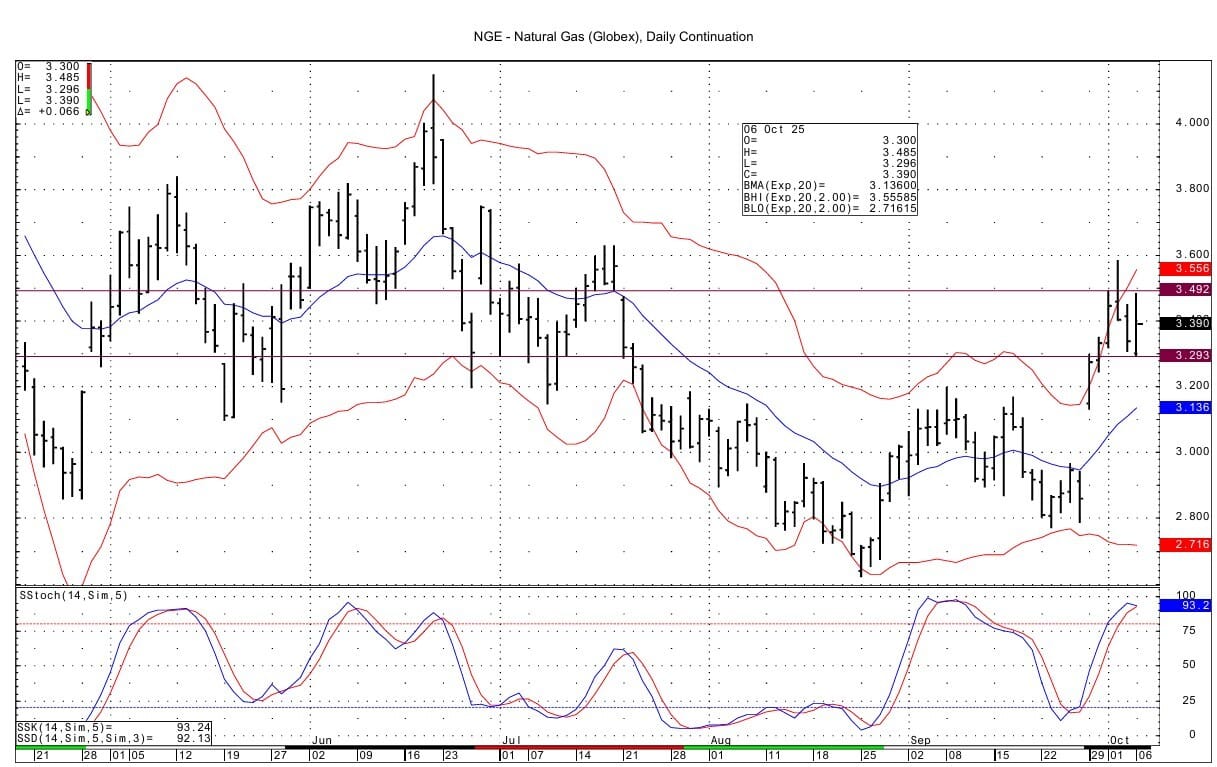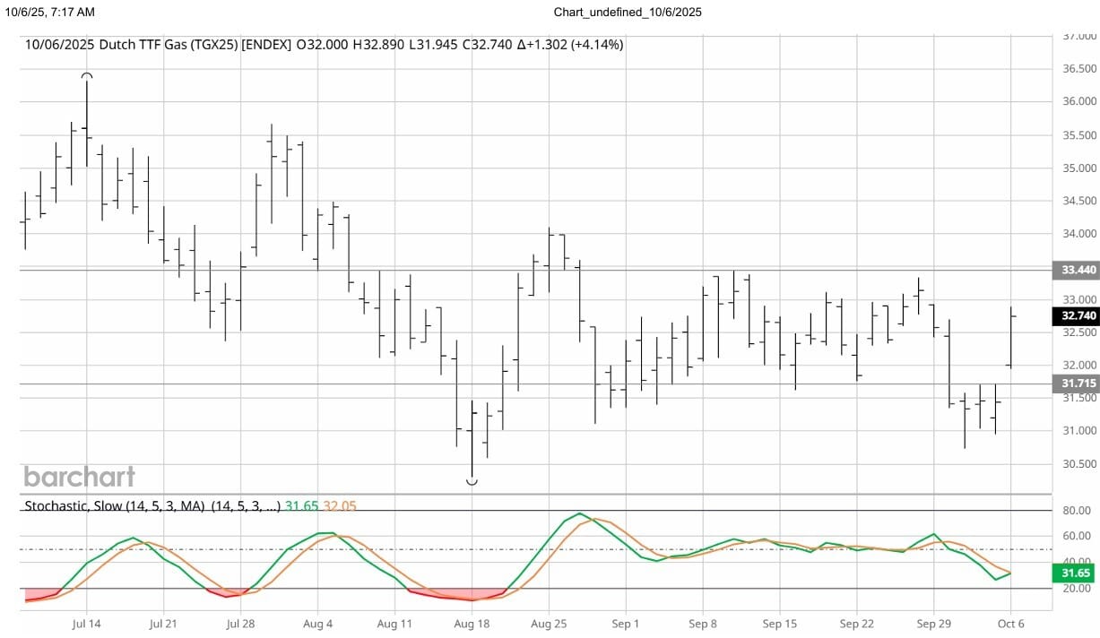 TTF prices in Europe have gapped higher today with Qatar suspending all maritime operations, due to a technical malfunction in the Global Positioning System (GPS). Additionally aiding TTF prices is the fact that EU gas storage stood at 82.75% of capacity as of October 4, down from 94.32% last year and at their lowest levels since 2021, data from industry lobby group Gas Infrastructure Europe showed. Europe will need to import up to 160 additional liquefied natural gas cargoes this winter due to lower storage and a decline in pipeline flows from Russia and Algeria, according to analysts and data, deepening its dependency on U.S. gas. By the end of the current winter in March 2026, storage volumes could drop to a seven-year low of 29% of capacity, according to Kpler. (Reuters)