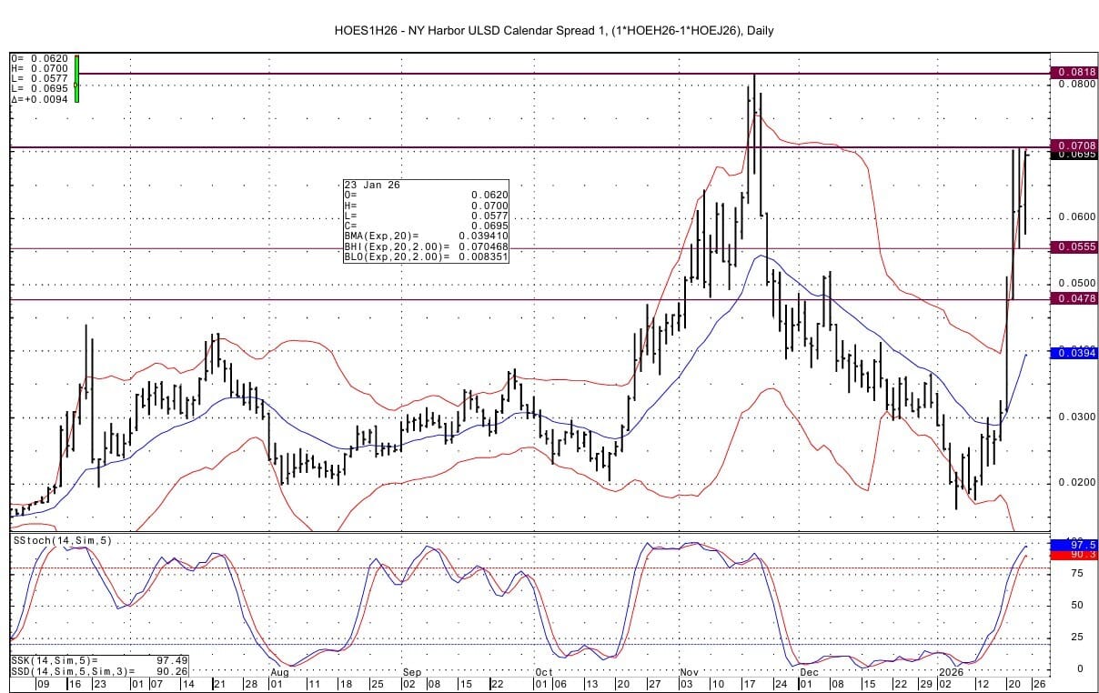 The March /April and April /May HO spreads are seeing momentum that is near overbought. Additionally cautionary for the bullish argument for the spreads in the immediate is the fact that they have tested their daily chart's upper bollinger bands this week. For the March April spread, the band intersects today at 7.0 cents and for the April May spread, it intersects at about 4.5 cents.
