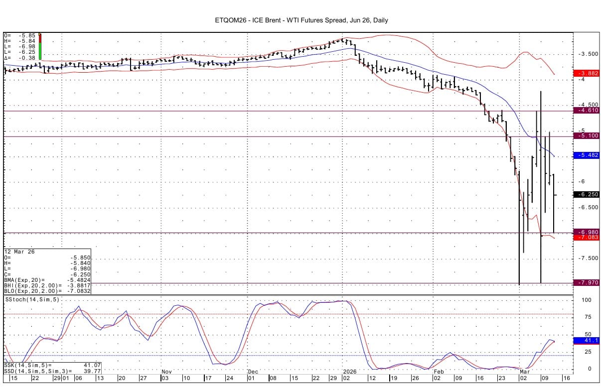 The June arb has momentum that looks poised to turn negative in a day or two. Support at -$6.95 was tested with today's low of -$6.98. Below that support for the WTI is likely at the recent lows at -$7.97/-$8.00. Upside resistance for the WTI versus the Brent comes in at -$5.10 and then at -$4.61.